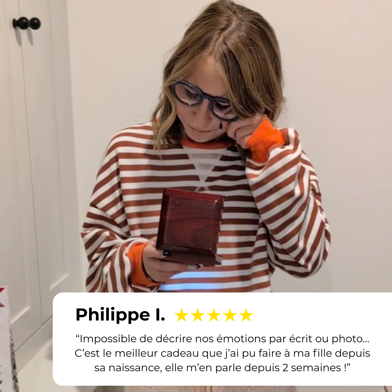"Elle a pleuré quand je lui ai offert. D'habitude elle ne pleure jamais ! Misson accomplie !"